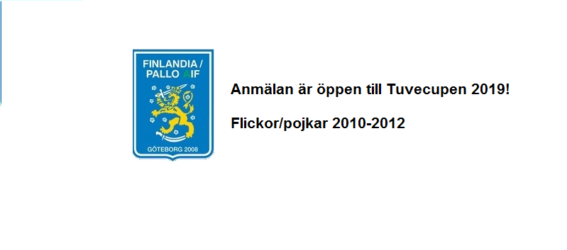 Tuvecupen är öppen för anmälan. Flickor/pojkar årskullarna 2010-2012. Välkomna! https://www.cupmate.nu/cup/finlandia-pallo-aif-tuvecupen Finlandia Pallo AIF 9 mar 2019 0kommentarer